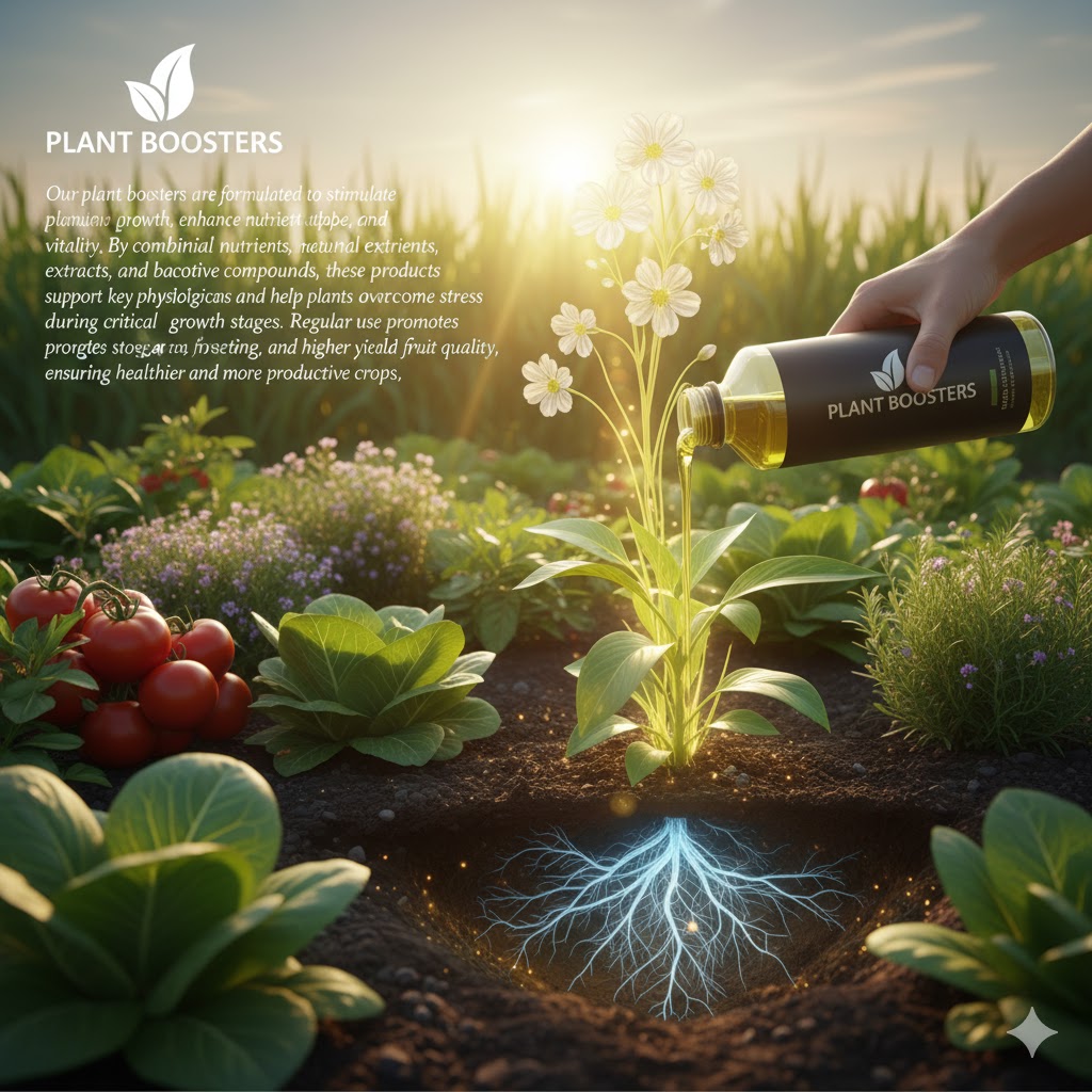 Our plant boosters are formulated to stimulate plant growth, enhance nutrient uptake, and improve overall vitality. By combining essential nutrients, natural extracts, and bioactive compounds, these products support key physiological functions and help plants overcome stress during critical growth stages. Regular use promotes stronger root systems, improved flowering and fruit setting, and higher yield quality, ensuring healthier and more productive crops.