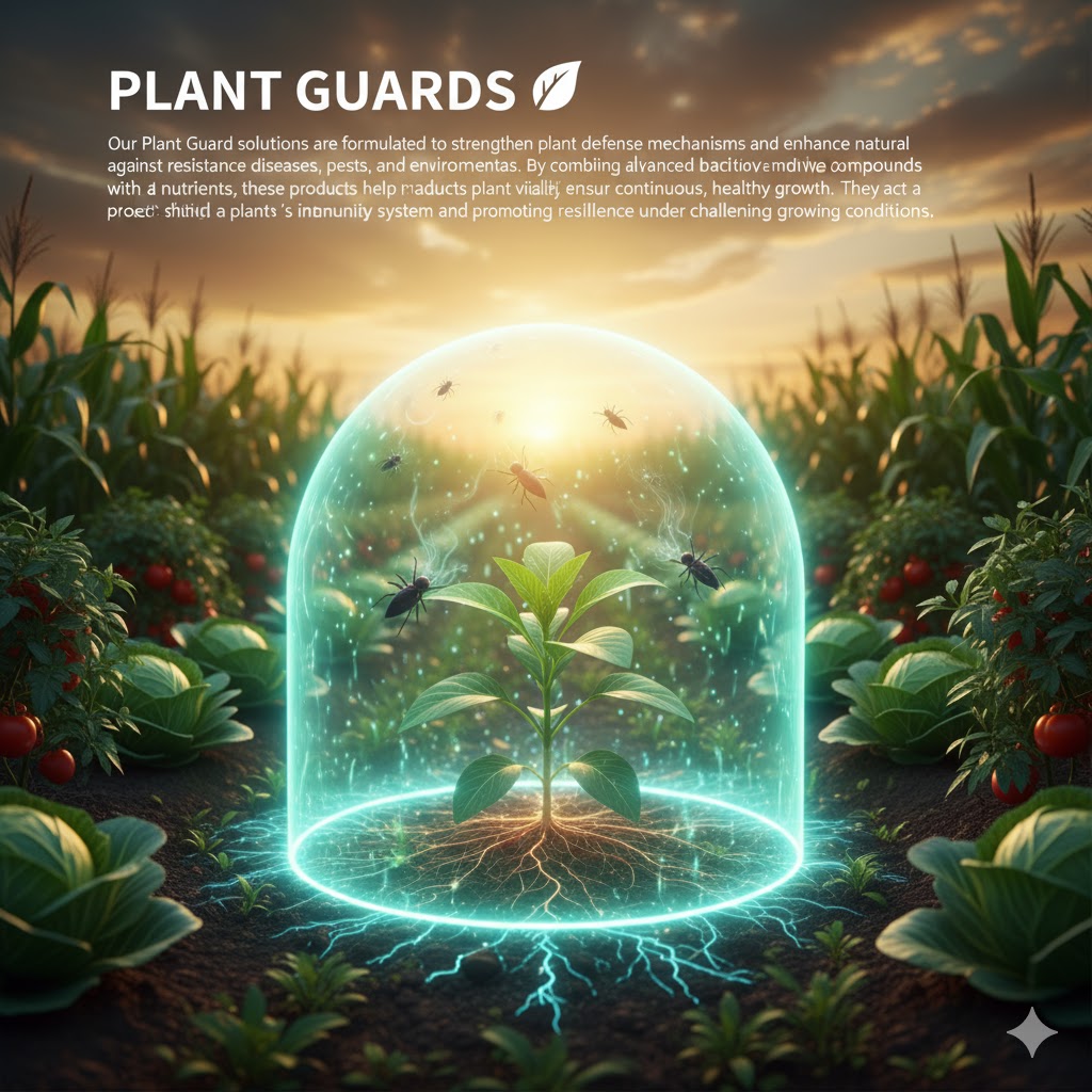 Our Plant Guard solutions are formulated to strengthen plant defense mechanisms and enhance natural resistance against diseases, pests, and environmental stresses. By combining advanced bioactive compounds with essential nutrients, these products help maintain plant vitality and ensure continuous, healthy growth. They act as a protective shield, supporting the plant’s internal immunity system and promoting resilience under challenging growing conditions.