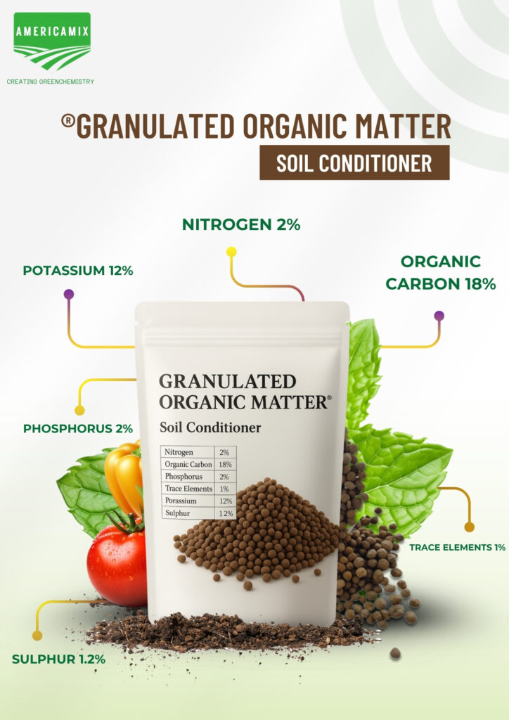 GRANULATED ORGANIC MATTER® is a unique formulation in the form of slow-release granules that ensure a steady and balanced supply of macro- and micronutrients throughout the growing period. With its high organic content, it stimulates beneficial microbial activity in the soil, boosts long-term fertility, and promotes healthy, sustainable plant growth.